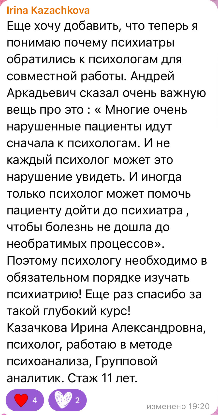 Хочу добавить, что теперь я понимаю почему психиатры обратились к психологам для совместной работы. Психологу необходимо в обязательном порядке изучать психиатрию! Еще раз спасибо за такой глубокий курс!