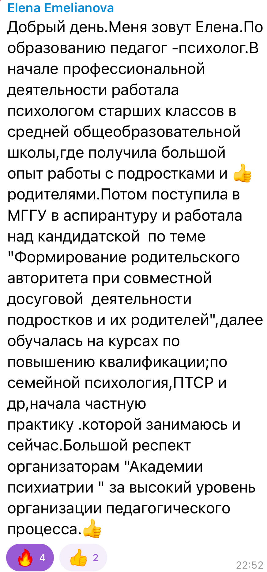 Добрый день. Меня зовут Елена. По образованию педагог-психолог. Большой респект организаторам «Академии психиатрии» за высокий уровень организации педагогического процесса.