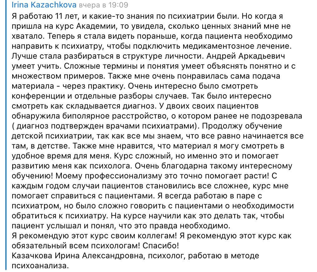 Я работаю 11 лет, и какие-то знания по психиатрии были. Но когда я пришла на курс Академии, то увидела, сколько ценных знаний мне не хватало. Теперь я стала видеть пораньше, когда пациента необходимо направить к психиатру, чтобы подключить медикаментозное лечение. Лучше стала разбираться в структуре личности.