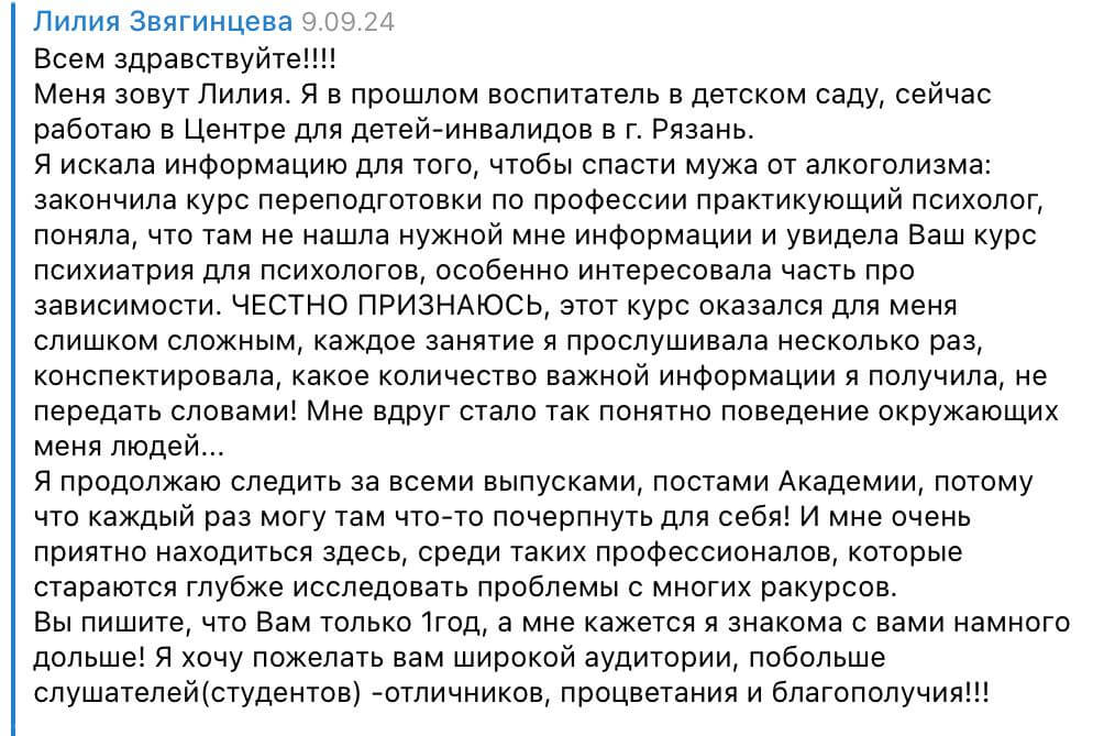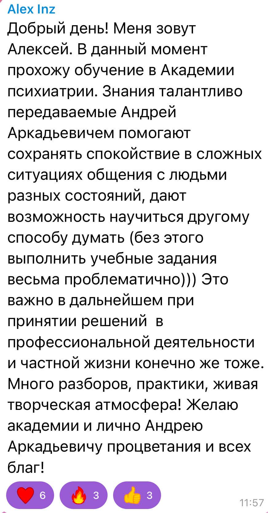 Знания талантливо передаваемые Андрей Аркадьевичем помогают сохранять спокойствие в сложных ситуациях общения с людьми разных состояний, дают возможность научиться другому способу думать. Много разборов, практики, живая творческая атмосфера! Желаю академии и лично Андрею Аркадьевичу процветания и всех благ!