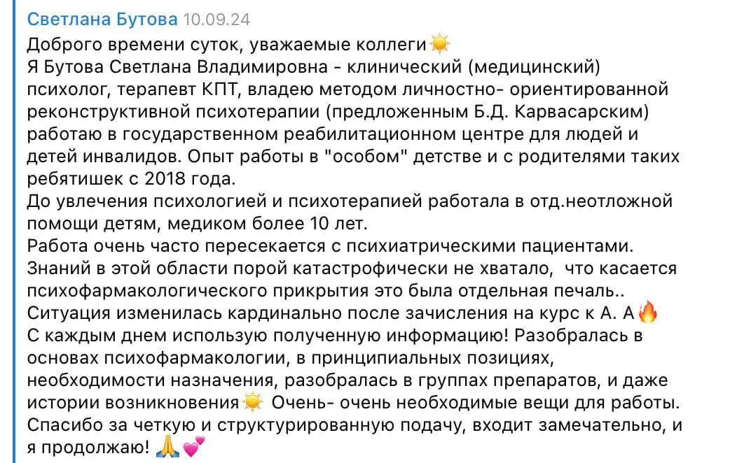 Знаний в этой области порой катастрофически не хватало, что касается психофармакологического прикрытия это была отдельная печаль… Ситуация изменилась кардинально после зачисления на курс к А. А к С каждым днем использую полученную информацию!