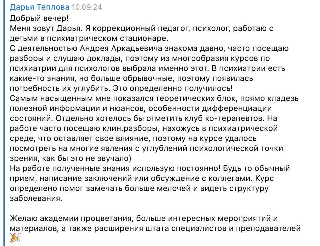 Отдельно хотелось бы отметить клуб ко-терапевтов. На работе часто посещаю клин. разборы, нахожусь в психиатрической среде, что оставляет свое влияние, поэтому на курсе удалось посмотреть на многие явления с углублений психологической точки зрения, как бы это не звучало)