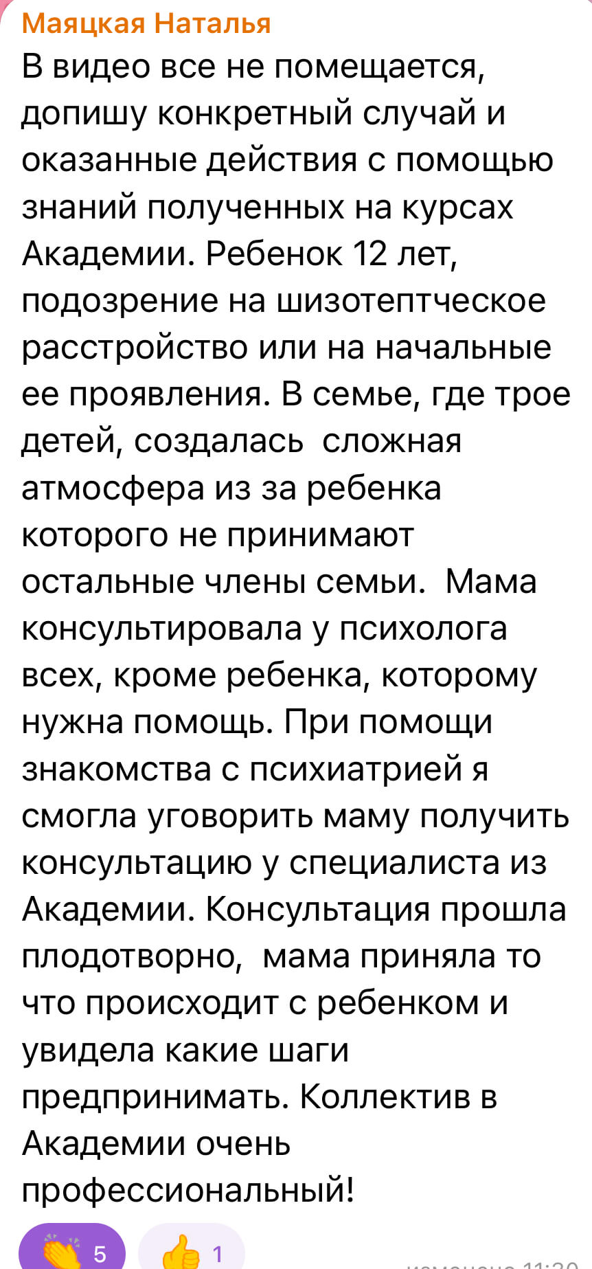 При помощи знакомства с психиатрией я смогла уговорить маму получить консультацию у специалиста из Академии. Консультация прошла плодотворно, мама приняла то что происходит с ребенком и увидела какие шаги предпринимать. Коллектив в Академии очень профессиональный!